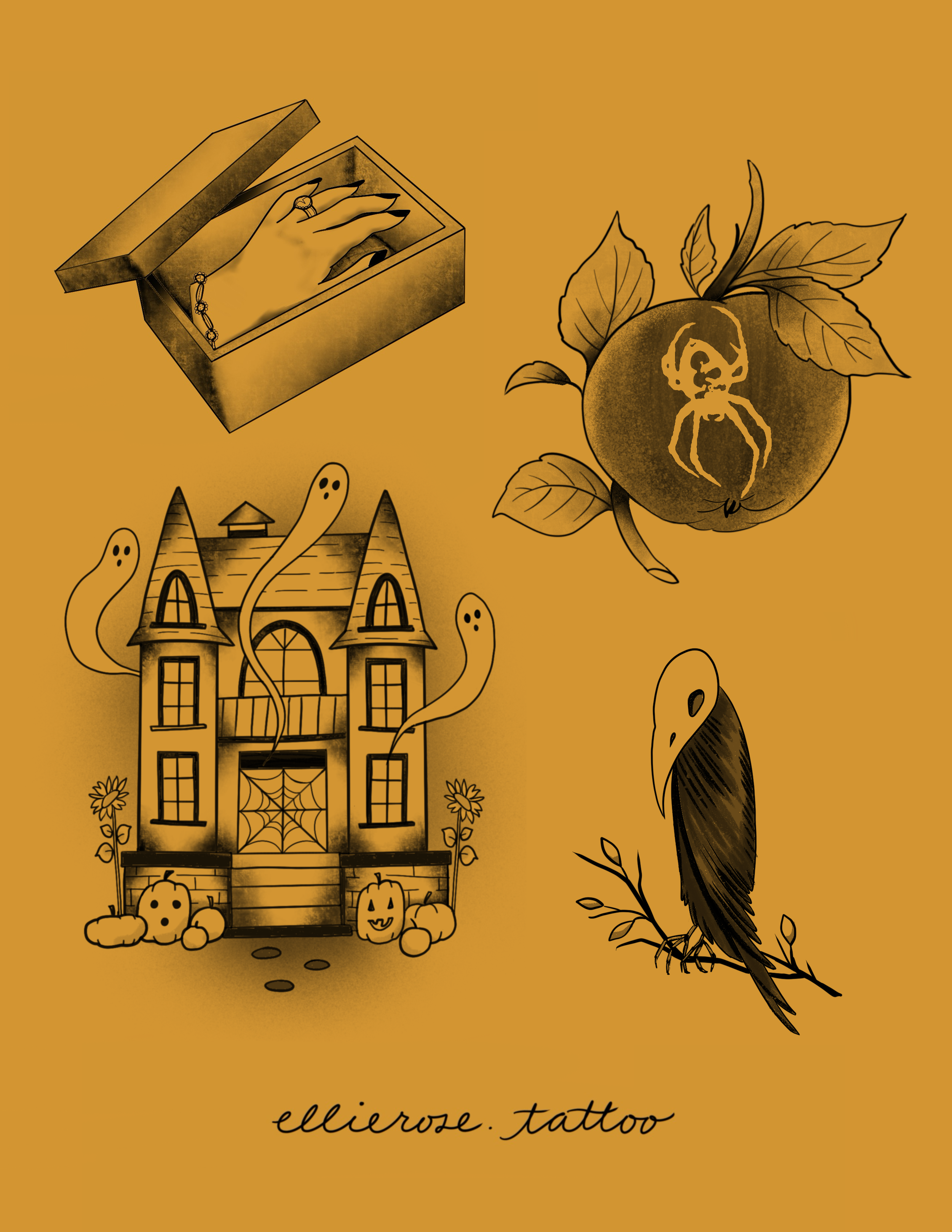 To book, contact me via email, text, or booking form and let me know which design you’d like! Prices for flash generally run in the range of $75-$400+ and exact pricing will be based on size, color vs black and gray, and placement. I’m happy to give a flat rate, just ask!